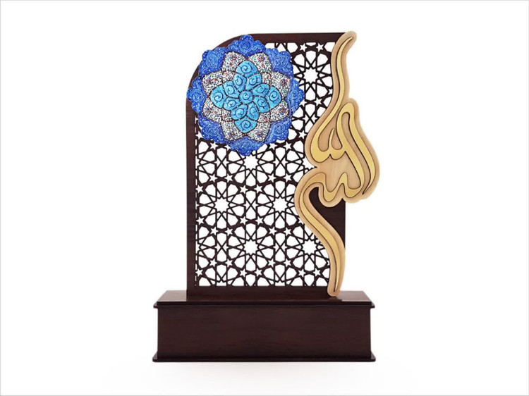بشقاب میناکاری روی مس همراه تندیس چوبی مشبک.قابل سفارش با هراآرم لوگوی شما.تندیس میناکاری