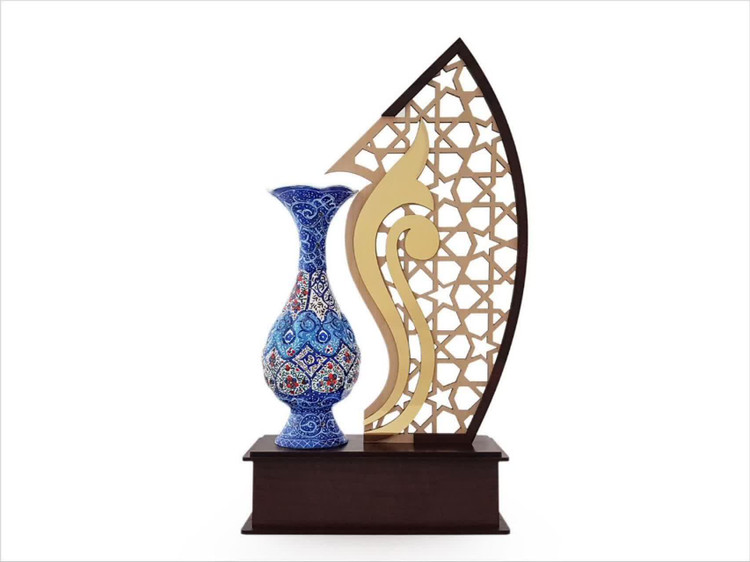 تندیس گلدان میناکاری ۱۶سانتی همراه تندیس مشبک چوبی.قابل سفارش تعداد بالا و با آرم و برند شما