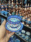 محصول مورد نظر شامل آینه و شمعدان و ۶عددکاسه بشقاب مینا کاری روی مس هست( بشقاب ۱۰سانت و کاسه۸سانت ) توسط استادکار اصفهان کارشده وسپس کوره شده و تمامی رنگها ثابت و قابل شستشو و استفاده می باشد
