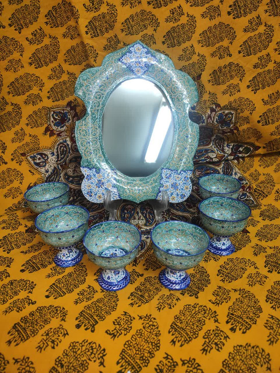 محصول هفت سین میناکاری سبز رنگ مورد نظر شامل آینه و۶ کاسه پایه دار کوچک میناکاری روی مس هست که توسط استادکار اصفهان کارشده وسپس کوره شده و تمامی رنگها ثابت و قابل شستشو و استفاده می باشد