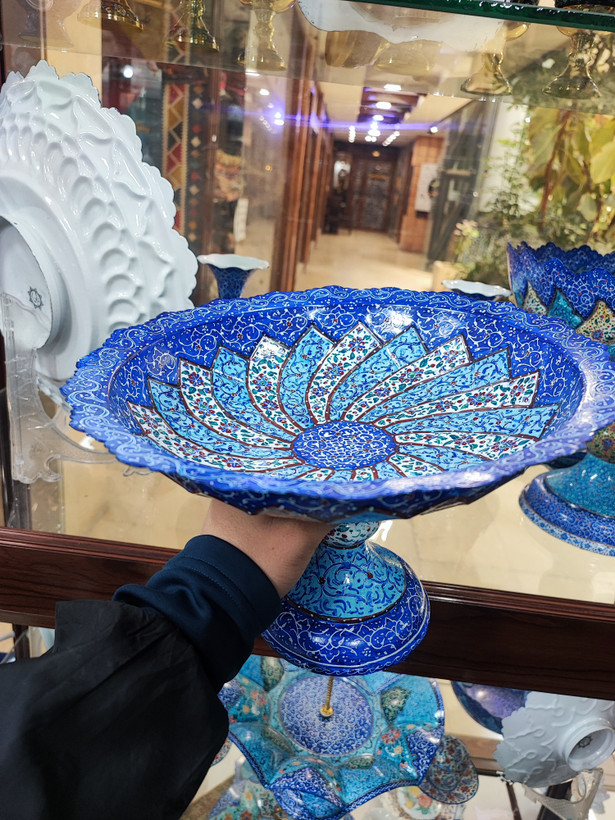 شیرینی خوری میناکاری روی مس محصول مورد نظر شیرینی خوری ۳۰ سانتی از جنس لز مس میباشد که توسط استاد کار شده و میناکاری شده و سپس کوره شده مامی رنگها ثابت و قابل شستشو شده است قابل استفاده برای مصارف روزانه و پذیرایی از جمله شیرینی میوه و کیک غیره میباشد