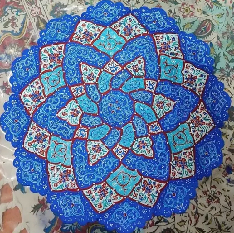 بشقاب مینا کاری ۲۵سانتی که جنس فلز مس هست توسط استاد کارشده وسپس کوره شده و تمامی رنگها ثابت و قابل شستشو میباشند
