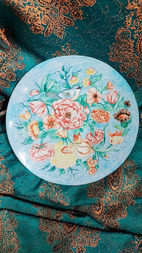 محصول مورد نظر قاب بشقاب گل و مرغ میناکاری بشقاب ۲۵سانتیمتری هست توسط استادکار میناکاری طرح گل و مرغ کارشده وسپس کوره شده و تمامی رنگها ثابت و قابل شستشو میباشند