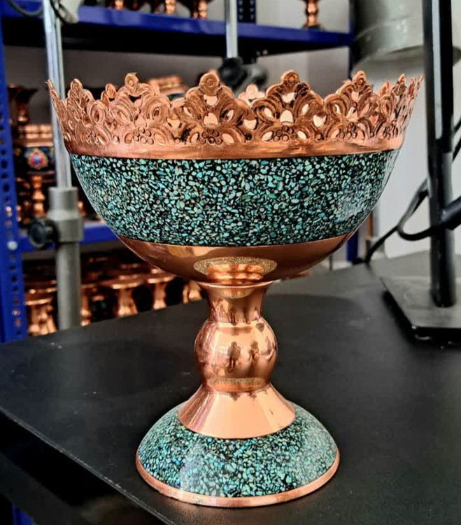 آجیل خوری فیروزه کوبی ویا کاسه پایه دار فیروزه کوبی ارتفاع۱۶سانتی.از جنس فلز مس و سنگ فیروزه اصل ..که پس از پرداخت و آماده شدن پلی استر و نانو شده و مقاوم در برابر رطوبت شده