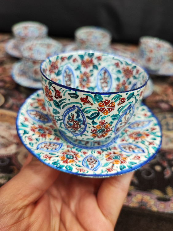 کاسه بشقاب قهوه خوری ست هفت سین آجیل خوری میناکاری روی مس صنایع دستی ایران اصفهان توسط استاد کارشده کوره شده رنگها ثابت و قابل شستشو و استفاده پذیرایی