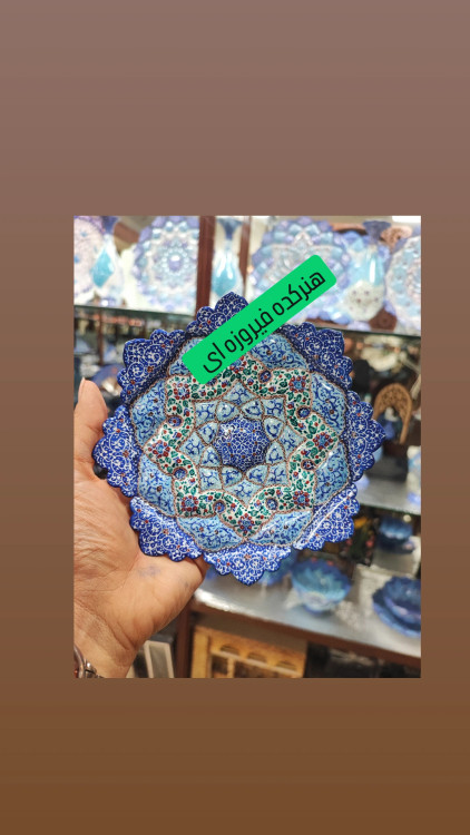 قاب بشقاب دیوار کوب میناکاری روی مس سایز۱۶سانتیمتری از جنس فلز مس صنایع دستی ایران اصفهان توسط استاد کارشده وسپس کوره شده و تمامی رنگها ثابت و قابل شستشو میباشند